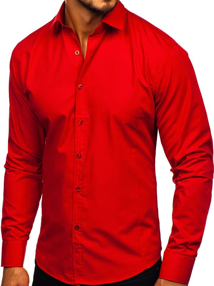 Camicia elegante a maniche lunghe da uomo in colore rosso Bolf 1703 è una posizione che dovrebbe essere nel guardaroba di ogni uomo, non solo di un uomo elegante. Questo modello è disponibile in una dozzina di colori più o meno intensi, che lo rendono facile da inserire in innumerevoli abiti casual e smart casual. La camicia da uomo liscia è consigliata agli amanti del minimalismo e dell'eleganza classica nella moda. Sono comode e ben tagliate. Un vero must nel guardaroba di un uomo d'affari consapevole. Un taglio semplice e classico in colori interessanti rende questo modello di camicia il tocco finale perfetto per molti stili di tutti i giorni. Camicia dal taglio slim fit, abbottonata, ha un pratico fondo arrotondato. Le maniche sono rifinite con polsini larghi e regolabili che si chiudono con un bottone. Ha un colletto classico con risvolti corti.