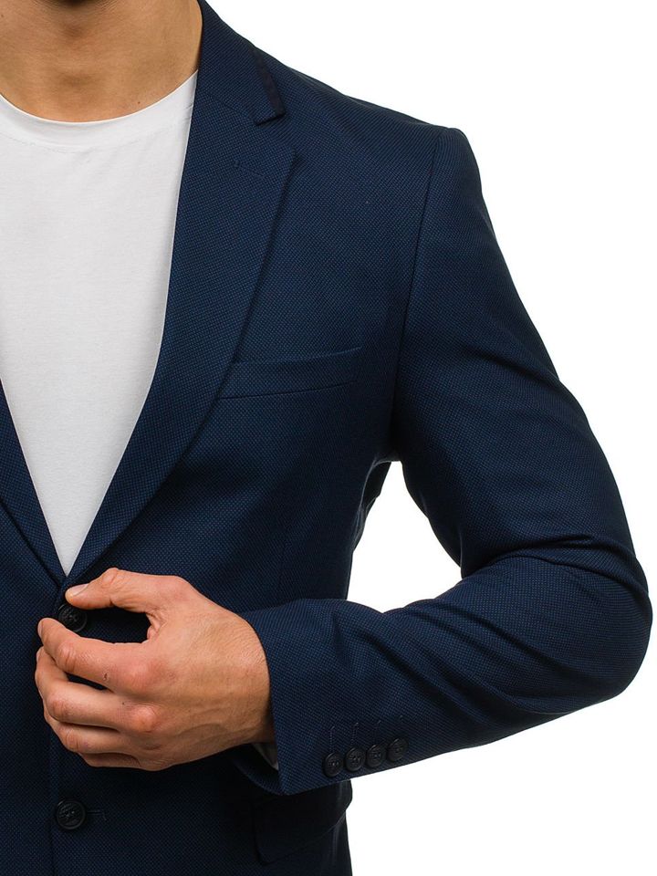 Molto elegante giacca d'abito blu modello slim fit da uomo dall'offerta della Bolf. Ha un taschino da fazzoletto, bordo decorativo accanto il collo, tasche con patta. L'elegante giacca d'abito blu da uomo, snellisce in modo fantastico, ha un aspetto sensazionale in outfit con camicia e pantaloni di tipo chino.