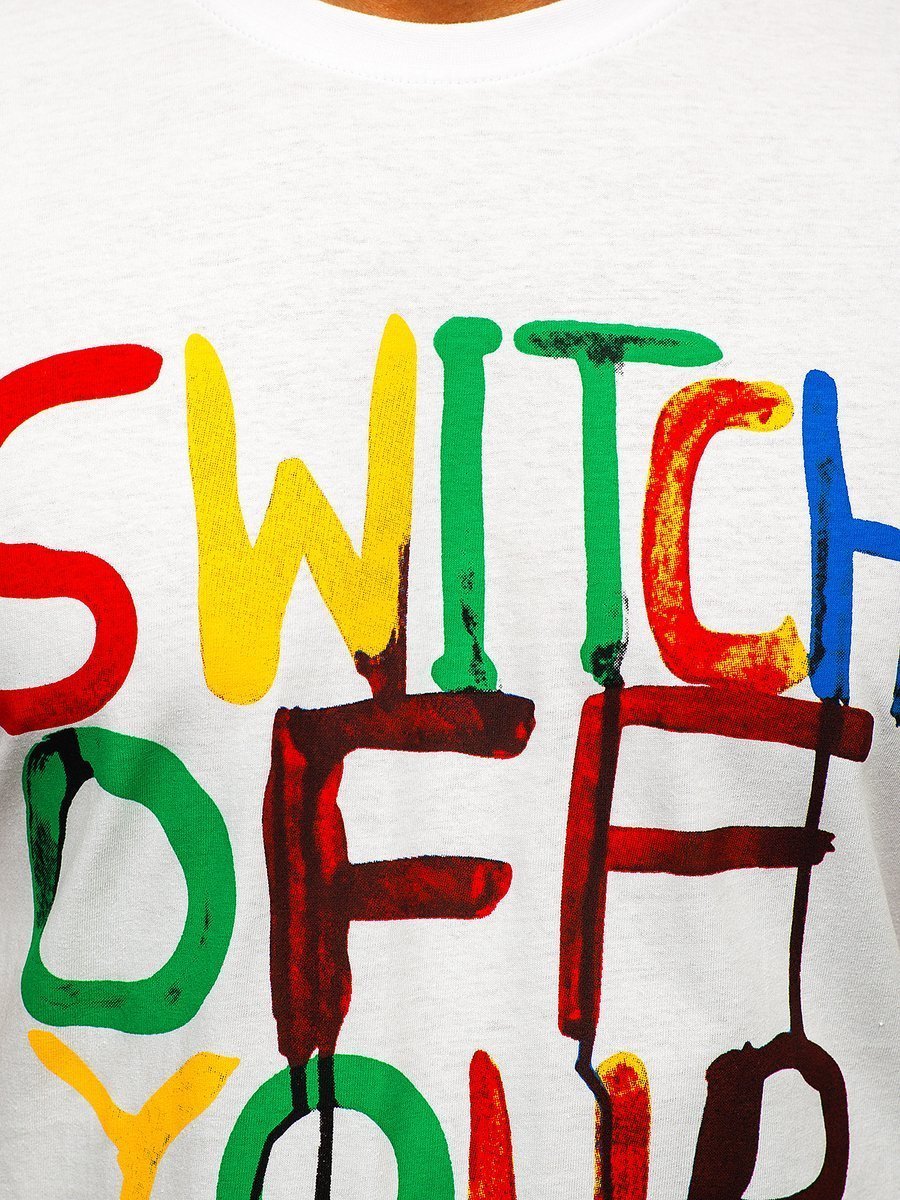 Una t-shirt bianca da uomo con stampa da Bolf 1181 ha una grande stampa a colori sul davanti. Le iscrizioni su di essa sembrano essere state dipinte con la vernice. La maglietta ha un taglio classico e una scollatura tonda rifinita con rifiniture. La parte posteriore è completamente liscia.