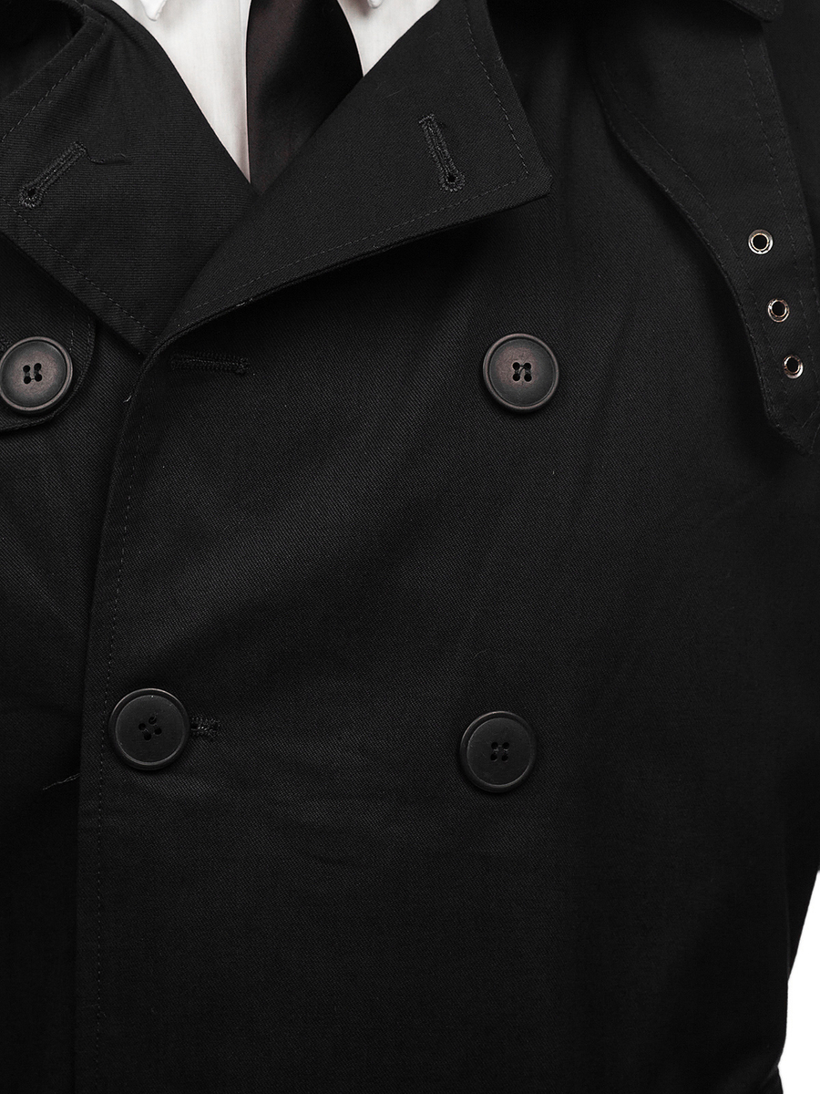 Trench nero doppiopetto da uomo con collo alto e cintura Bolf 5569 è un prodotto che aggiungerà eleganza e carattere chic a ogni uomo. Un impermeabile doppiopetto dovrebbe essere nel guardaroba di un uomo alla moda. Il prodotto si chiude con bottoni e viene fornito con cintura. Il collo rovesciato con chiusura a bottone aggiuntivo protegge perfettamente dal freddo. Due tasche esterne senza chiusura e una tasca interna sono elementi utili del cappotto. Ci sono elementi di fissaggio decorativi all'estremità delle maniche. Per gli appassionati di stile casual e semi-elegante, un impermeabile è un must have. È realizzato in cotone al 100%, sembra fantastico in combinazione con una camicia e pantaloni in tessuto.