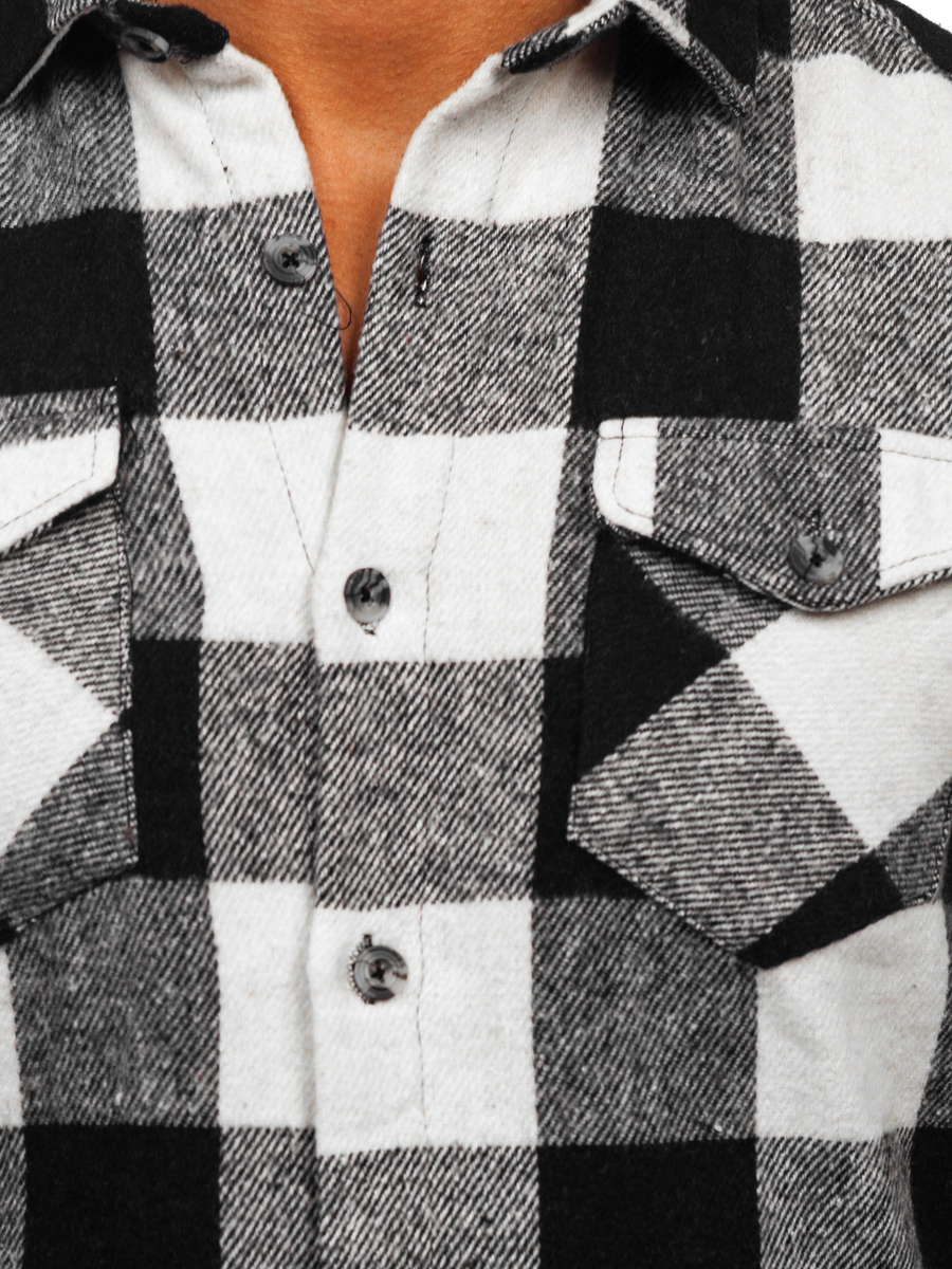 La camicia maschile di flanella a maniche lunghe Bolf 20723 in colore bianco-nero, è un modello abbottonato con il colletto italiano. La camicia ha due taschine di stile con il bottoncino. Il bordo è arrotondato Il prodotto ha i polsini, anch'essi allacciati con un bottone.