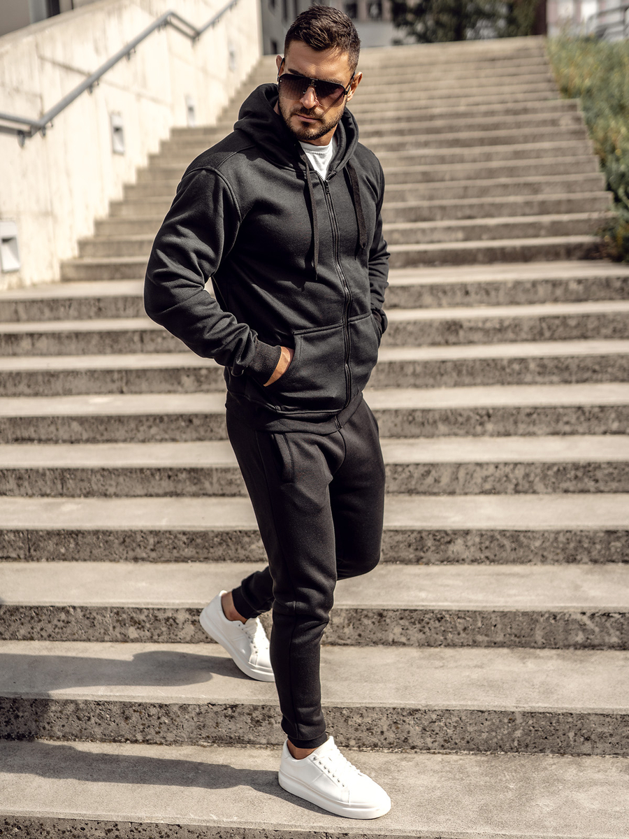 La tuta da uomo nera con cappuccio e zip Bolf D004 è la scelta perfetta per ogni occasione e stagione. Il set include una felpa con cappuccio e pantaloni della tuta. Felpa dal taglio classico, allacciata con cerniera. Ha un pratico cappuccio e due tasche laterali. Il fondo e le maniche della felpa sono rifiniti con un guardolo, che fornisce calore e protezione dal vento nelle giornate più fredde. I pantaloni sono regolabili in vita con un forte guardolo e coulisse, e due tasche sui lati. Un taglio semplice e aderente conferisce loro un aspetto sportivo. Questo modello è realizzzato in tessuto delicato e piacevole al tatto. Un set di tute può essere una base universale per la costruzione di stilizzazioni quotidiane o sportive. È disponibile in una dozzina di diverse versioni di colore. Grazie a un'ampia gamma di colori, non solo sceglierai qualcosa per te, ma abbinerai anche la tuta al tuo stile ogni giorno. Il set si abbinerà perfettamente a una t-shirt con una leggera giacca mezza stagione o giacca sportiva.