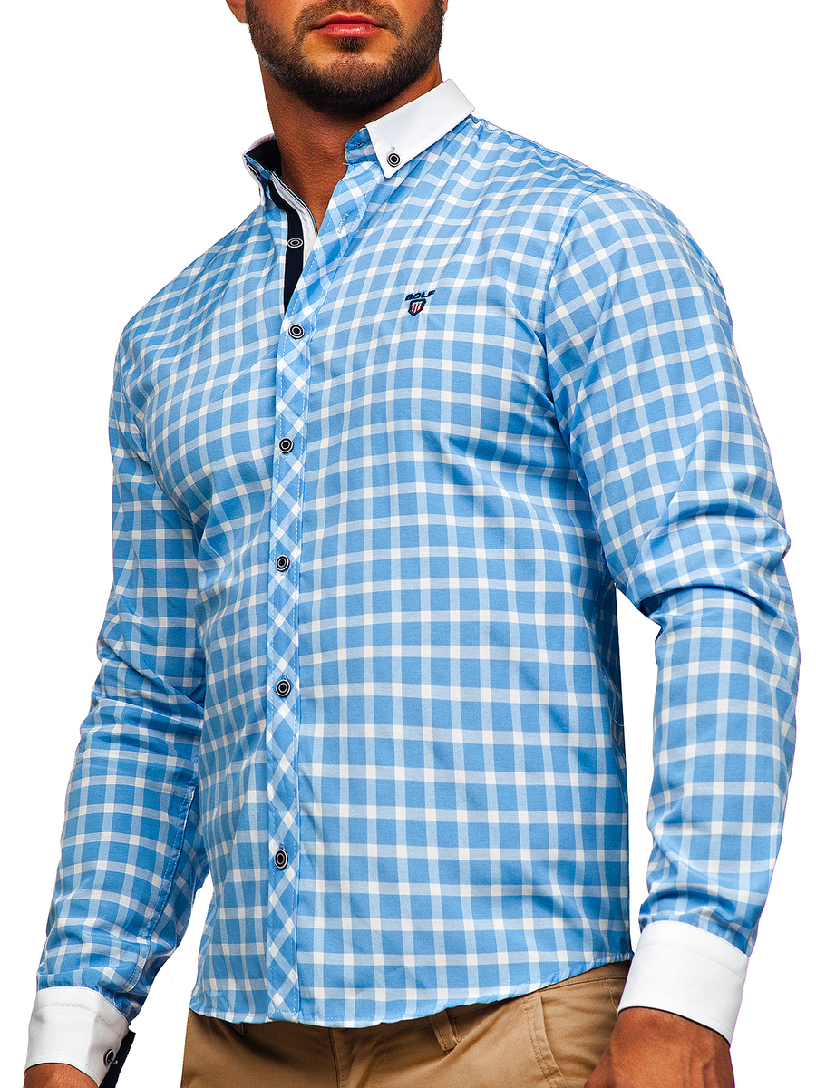 Elegante camicia a scacchi a maniche lunghe da uomo celeste Bolf 5737-1, abbottonata, ha il colletto "button down". Presenta polsini regolabili con un solo bottone. Un modello slim fit molto amato, con fondo della camicia arrotondato per una silhouette perfetta. Le toppe sui gomiti e il logo ricamato sul petto conferiscono alla camicia un aspetto non convenzionale. Il prodotto è disponibile in diverse varianti di colore. La camicia sarà perfetta sia per l'uso quotidiano che per le occasioni più formali. Con pantaloni chino e giacca d'abito otterrai un look classico ed elegante. Se vuoi un outfit più casual, indossalo con i jeans e giacca in pelle!