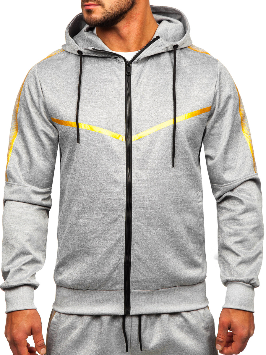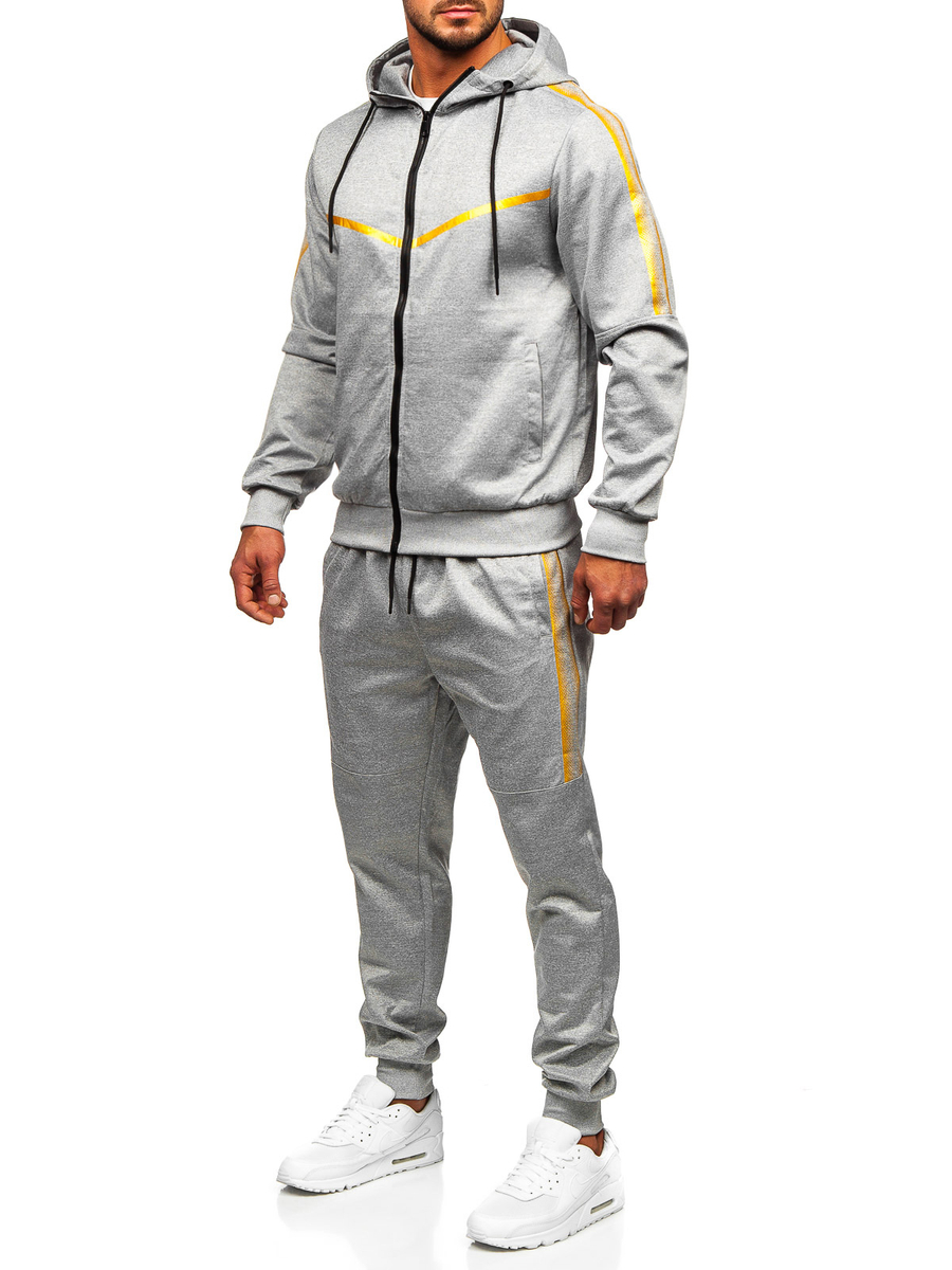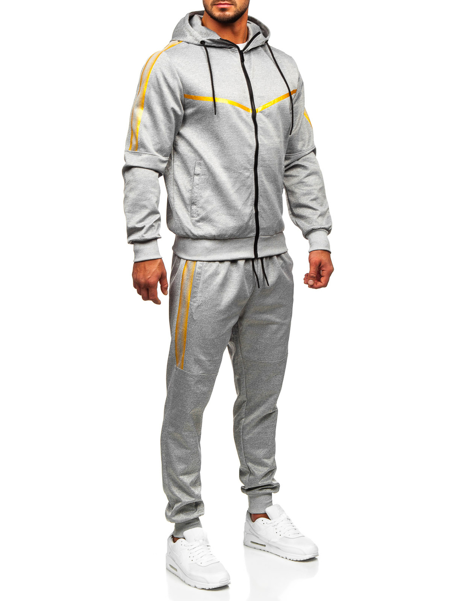 La tuta sportiva con cappuccio grigia da uomo Bolf 27C8117 è perfetta per tutti coloro che amano il comfort e lo sport! Il set comprende una felpa e pantaloni della tuta. La felpa ha un cappuccio regolabile, un colletto rialzato e due tasche esterne. I pantaloni sono regolabili in vita con un robusto guardolo e coulisse, e due tasche sui lati. Un taglio semplice e aderente conferisce loro un aspetto sportivo. Una stampa alla moda, che ritroviamo sia sulla felpa che sui pantaloni, ti darà carattere e ti farà risaltare in palestra! Questo modello è realizzzato in tessuto delicato e piacevole al tatto. Sia la felpa che i pantaloni possono essere abbinati ad altri capi di abbigliamento, ottenendo così tante possibilità per creare styling di tutti i giorni. Il set si adatterà perfettamente con una t-shirt e gilet.