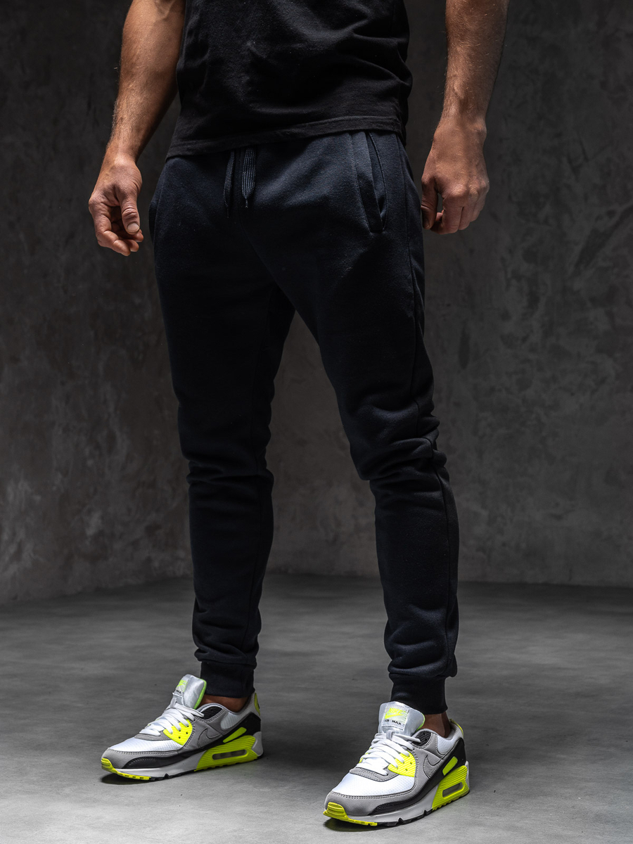 Pantaloni della tuta da uomo blu inchiostro XW01-C. I pantaloni hanno la coulisse e la regolazione in vita con coulisse e due tasche laterali. L'aspetto sportivo si ottiene grazie al suo taglio semplice e l'elastici sulle gambe. Questo modello è realizzato in tessuto delicato e piacevole al tatto, che si abbinerà perfettamente al corpo. Il carattere dei pantaloni è aggiunto grazie alla sua coloristica interessante.