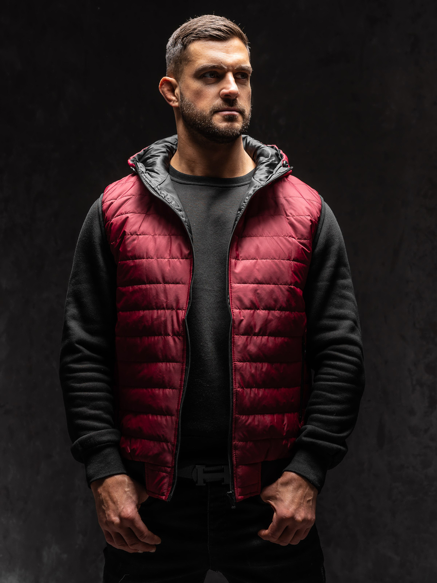 Il gilet trapuntato con cappuccio bordò da uomo Bolf MY88A1 è perfetto per creare outfit autunnali e invernali. E' chiuso con la cerniera ed ha il collo alto Il cappuccio non rimovibile protegge perfettamente da pioggia e vento. Un elemento utile sono due tasche esterne con cerniera. Il giromanica è rifinito con un bordino elastico e il fondo è rifinito con una bordatura. Il prodotto troverà il suo posto nel guardaroba di ogni uomo che apprezza uno stile sportivo. Il gilet può essere indossato per una passeggiata, per fare jogging o durante una gita nel fine settimana. E' realizzata in 100% in poliestere. Si abbinerà bene con longsleeve, jeans o pantaloni di tuta.