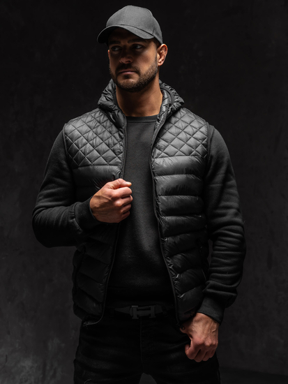 Gilet trapuntato con cappuccio nero da uomo Bolf HDL88003A1 è un'ottima proposta per le giornate autunnali. Vale la pena avere un gilet nel guardaroba e usarlo nelle giornate fredde. Sarà utile durante i viaggi in città, le passeggiate e gli incontri con gli amici. È caldo ed elegante. Il gilet è trapuntato su tutta la sua superficie, è classico nel taglio, sarà un'ottima alternativa ad una giacca nella stagione autunnale. Il prodotto ha due tipi di trapuntatura, la parte superiore è trapuntata a rombi, la parte inferiore a righe orizzontali. La trapuntatura aggiunge un carattere e uno stile sportivo al gilet. Ha un collo alto abbinato a un pratico cappuccio. Il gilet è chiuso con cerniera. La parte inferiore ed i fori per le mani sono rifiniti con bordi elasticizzati con lo stesso colore. Ha due tasche esterne molto pratiche con cerniere.