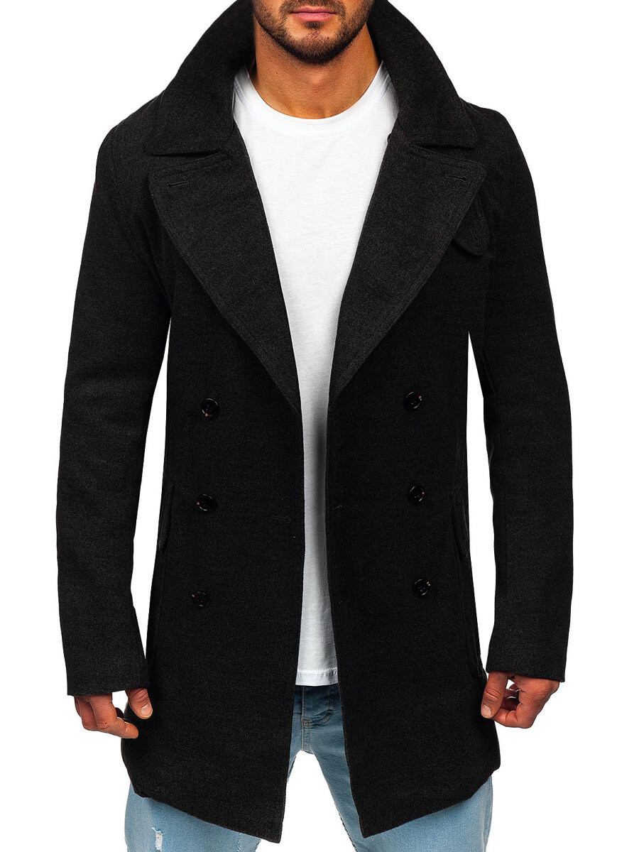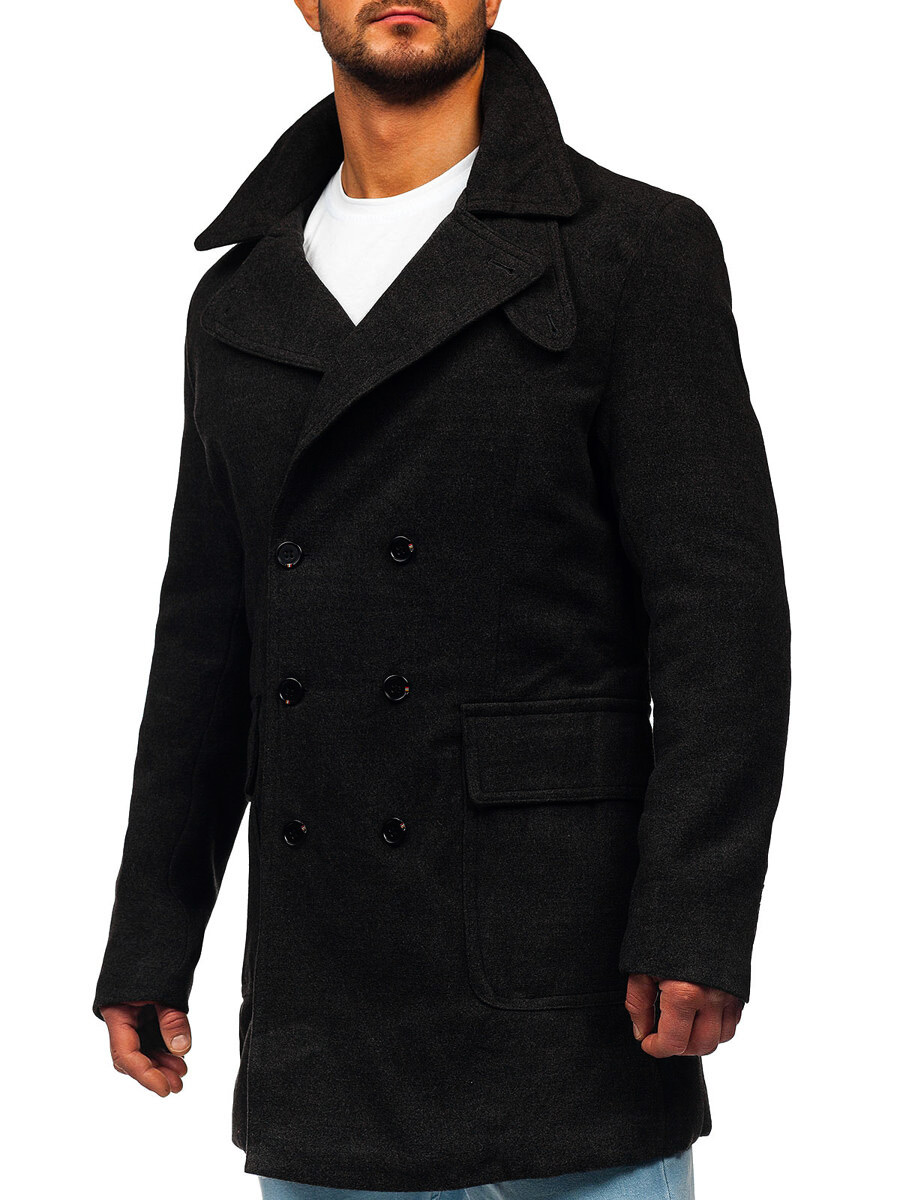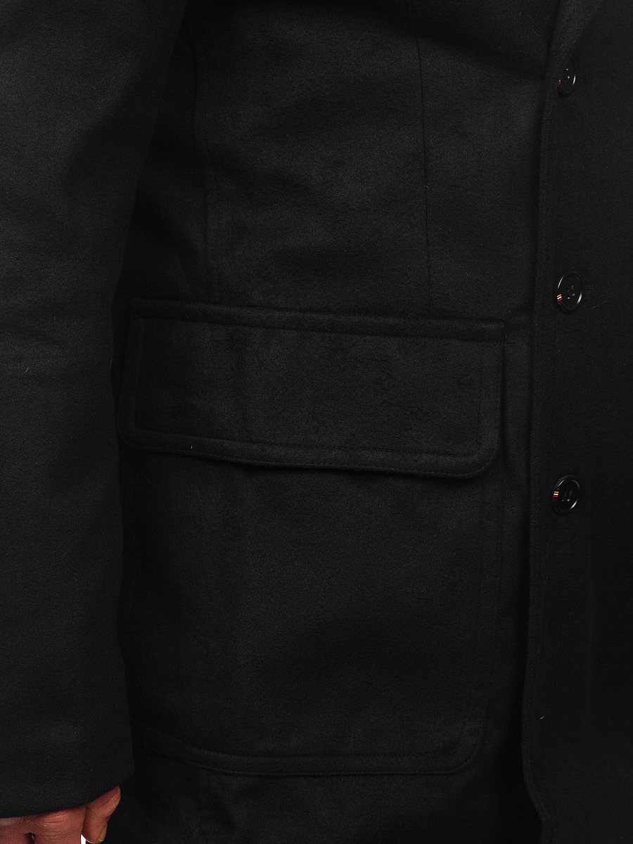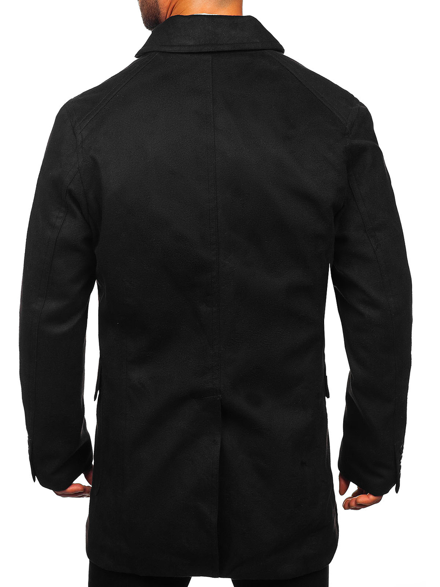 Cappotto invernale da uomo nero Bolf 1048A è realizzato in tessuto isolante, perfetto per l'inverno. È chiuso con bottoni e una chiusura a doppiopetto aggiunge stile ed eleganza. Ha due tasche esterne con bottoni a pressione e sormontate da una patta alla moda e una tasca interna chiusa con un bottone. Un cappotto dal taglio aderente, si adatta perfettamente alla figura atletica maschile. Ha un collare di tipo inverso e un'ulteriore chiusura a bottone al collo Il prodotto in nero è perfetto sia per gli stili più sobri che per quelli più audaci.